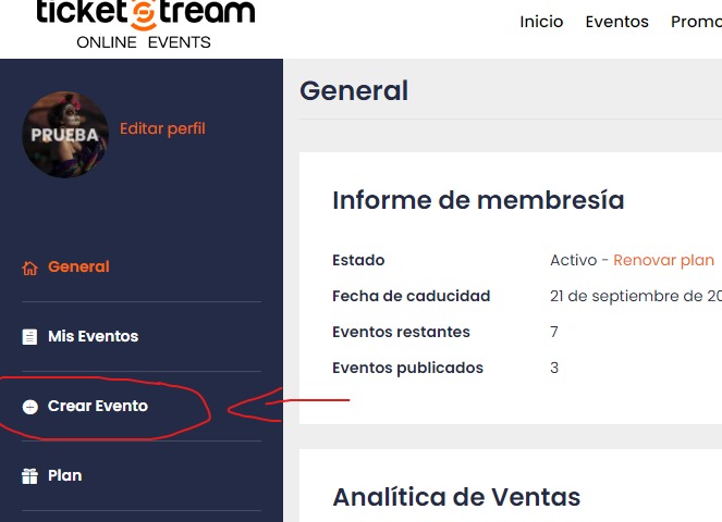 Ok, para empezar tendrás que iniciar sesión con tu cuenta habilitada para vender y activada un plan, con eso, tendrás que ir a la opción de «Crear Evento», y ahí podremos seguir para crear un evento.